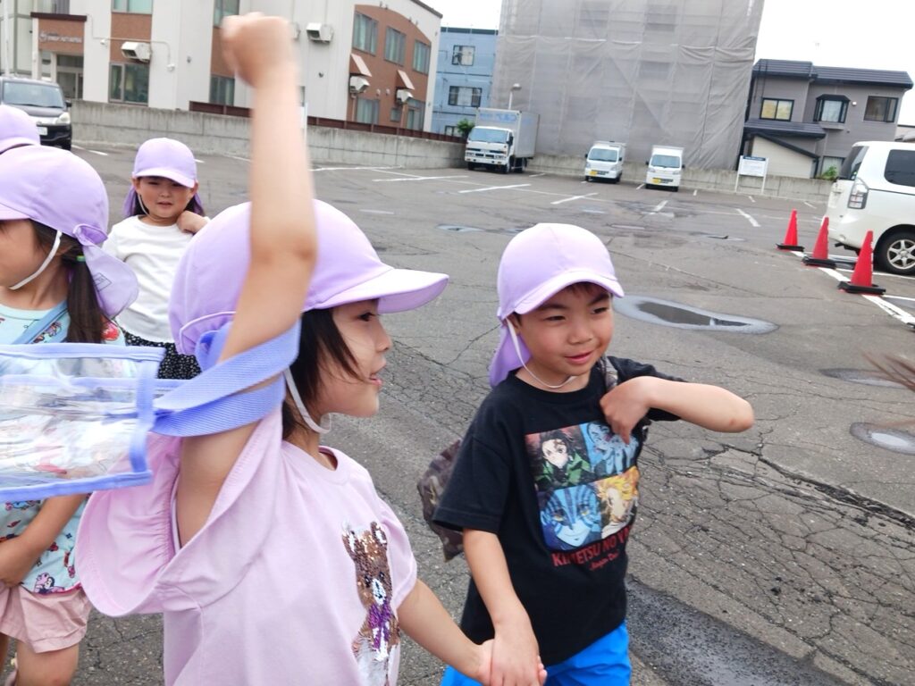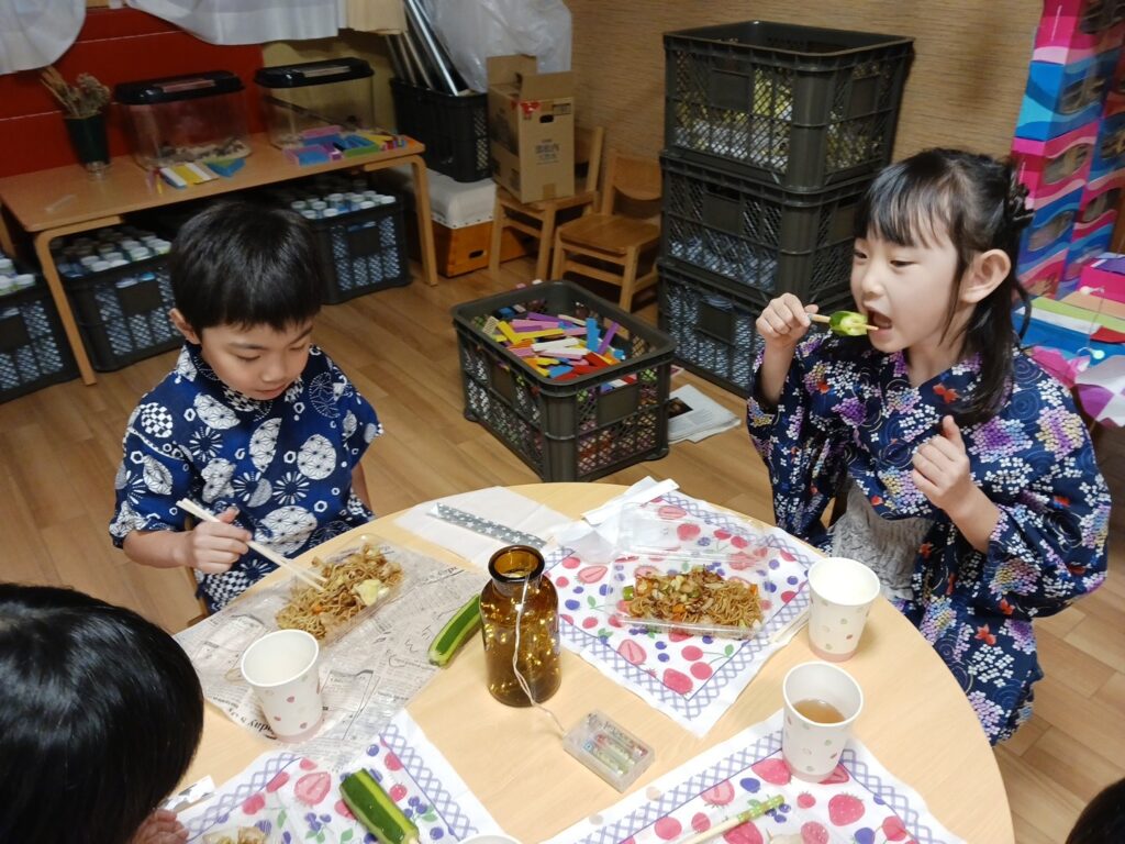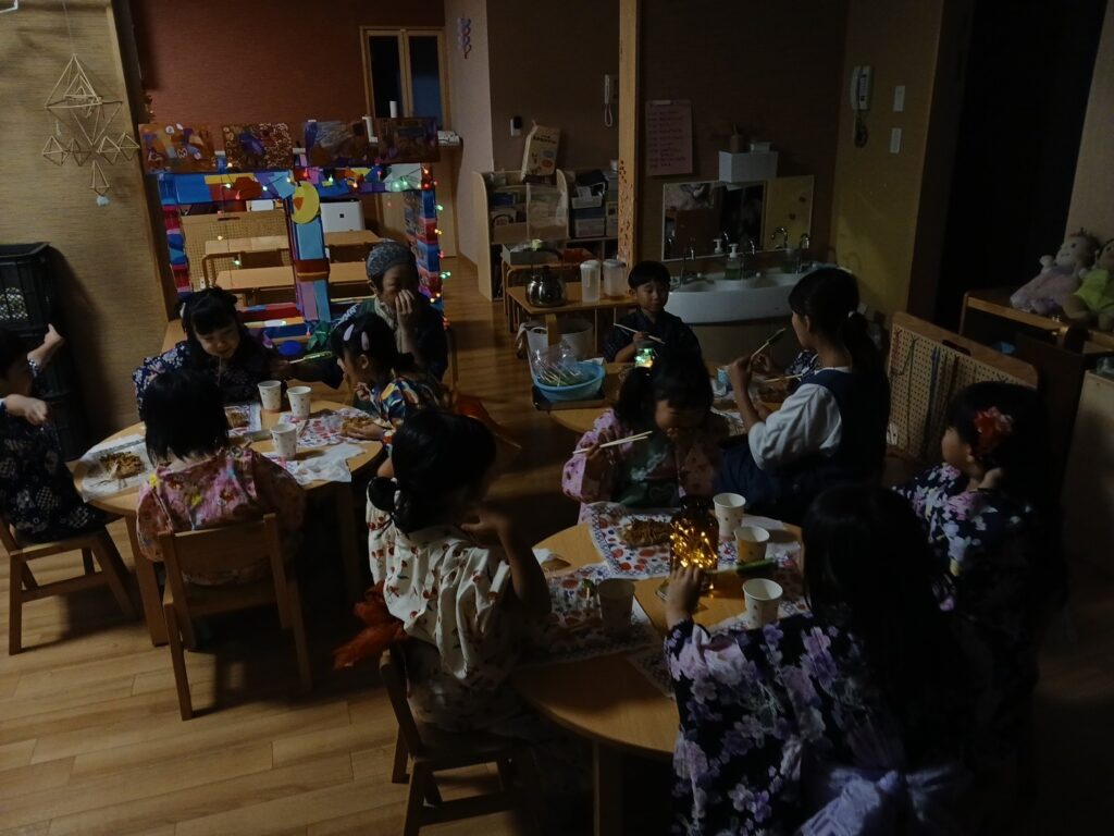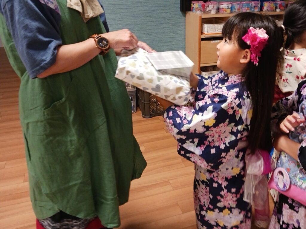 夕方も「雨、止みますように、、、」と願う様子も。結局止むことはなかったのですが、部屋を最小限の明るさにして食べたり、作ったランタンで園内探検をしていつもと違う雰囲気を味わえて楽しんでいました。最後は夕涼み会の主催者様から、雨の中届けてくださったお土産を、嬉しそうに受け取っていました。雨というハプニングがありながらも全力で楽しむ子ども達、このハプニングも思い出になるといいなぁと感じました。