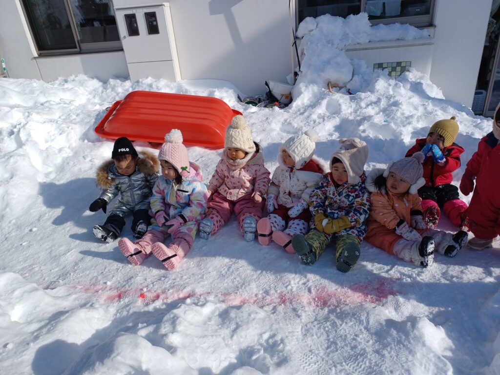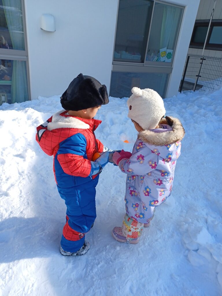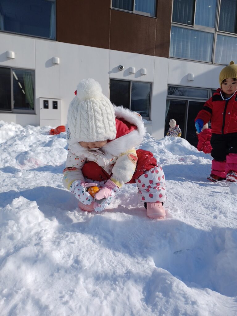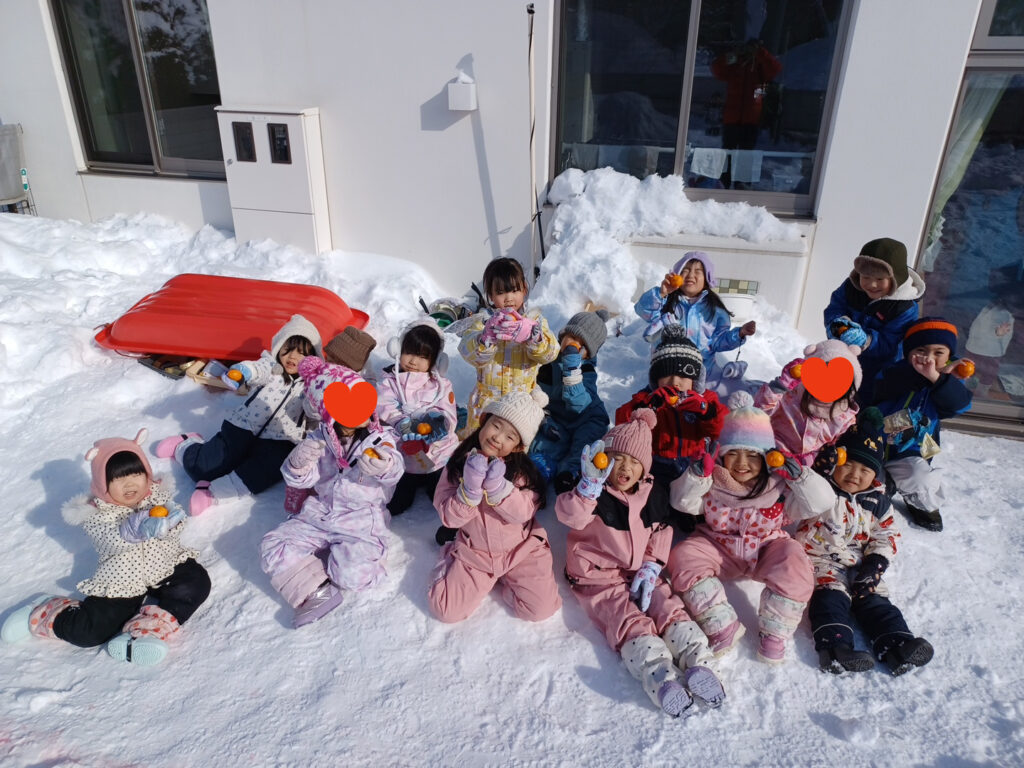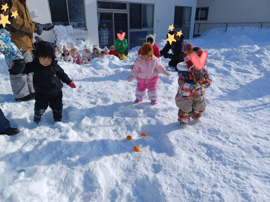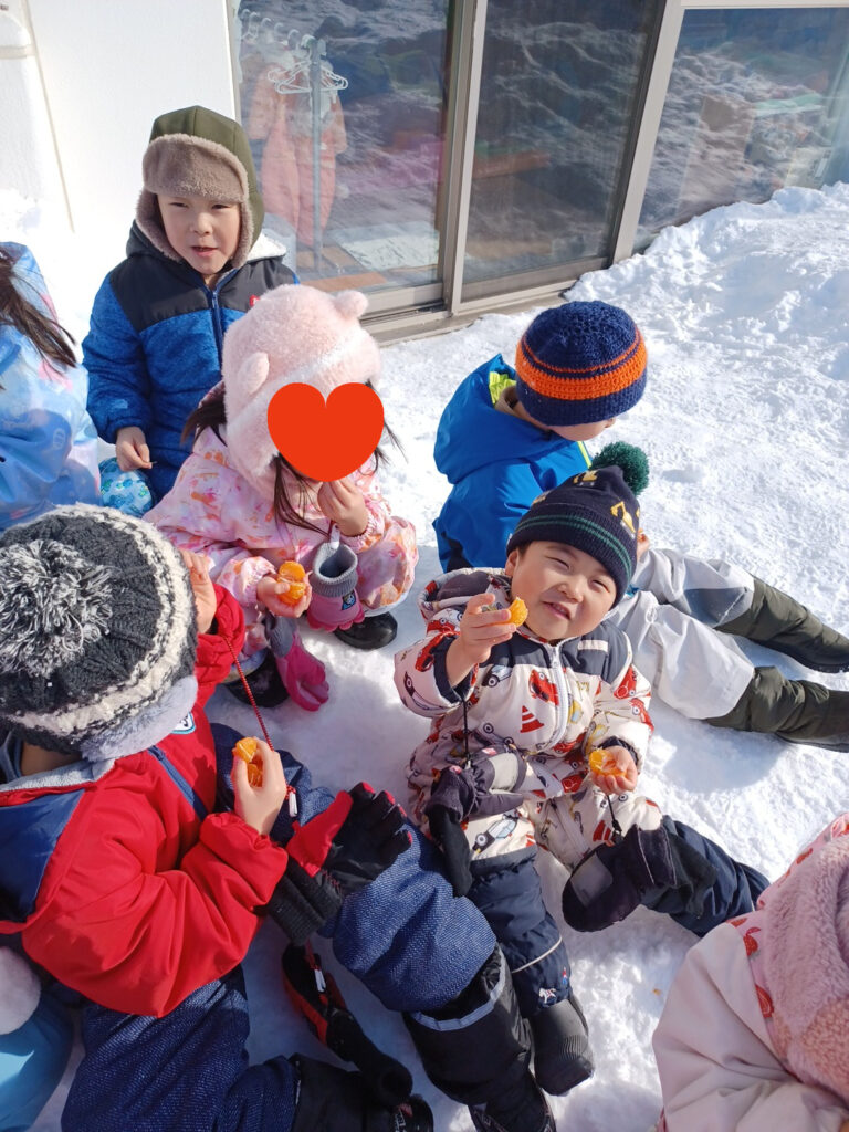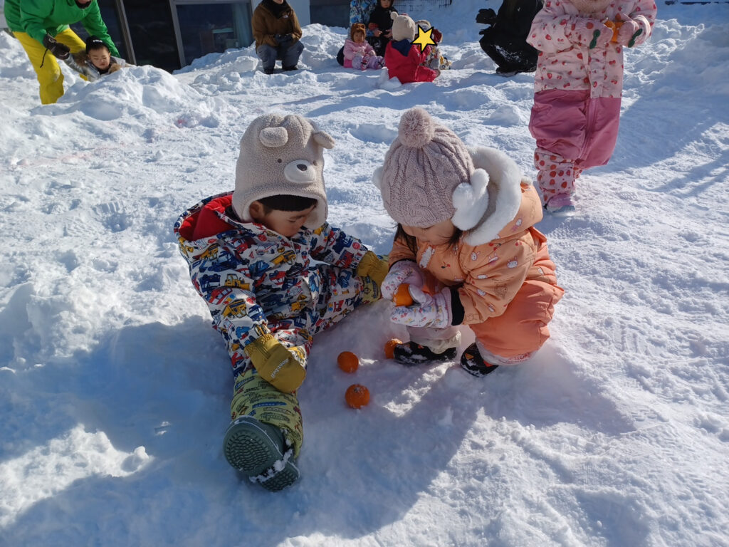子どもたちにとってはうれしい雪⛄今年も園庭で、元気にみかん探しを行いました!おはな・おひさま組は山からコロコロ転がるみかんを自分で拾いに行きました。小さな手で一生懸命みかんをひろう姿がただただ可愛くて癒されました♡おそら・のはら・はちみつ・みつばち組はレベルアップして、雪の中に隠されたみかんを探しました。みかんに似ているオレンジ色のボール!!も隠されているので、🍊あった!!と思ったら、ボールだった!!と、また探しに行き、無事に全員みかんを探すことが出来ました。お天気もよく大きいお友だちは園庭でみかんを食べて、楽しい時間となりました。